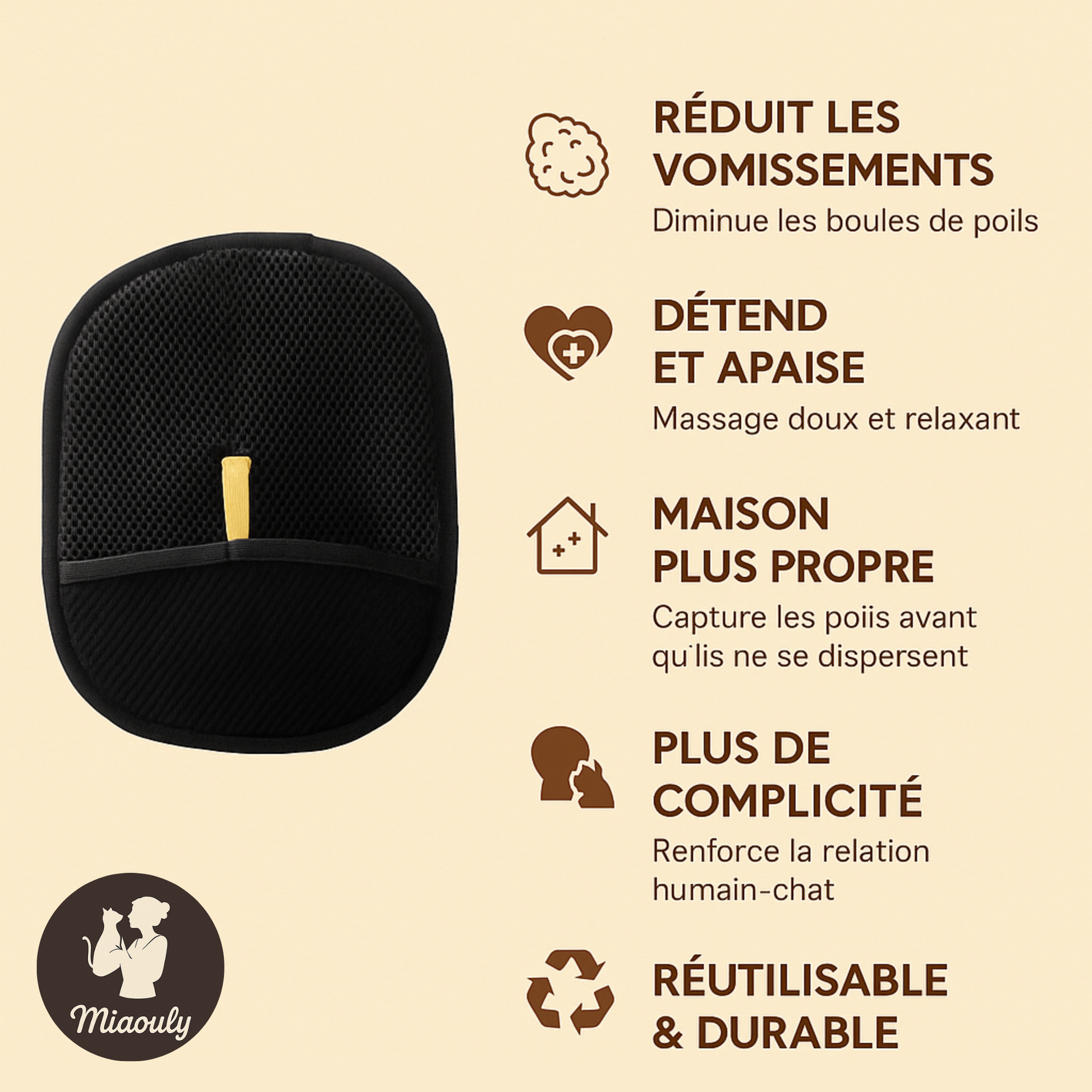 Sa texture douce transforme le toilettage en moment de détente. Moins de stress pour votre chat, plus de plaisir pour vous.